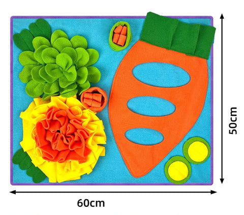 Le tapis est conçu en matière douce et résistante, avec des éléments cousus en relief : carottes à poches, feuilles superposées, fleurs à pétales, et zones circulaires à garnir. Le fond est antidérapant, garantissant une stabilité parfaite même sur sol lisse. Le maître peut choisir où et quoi cacher : foin dans les carottes, granulés sous les pétales, fruits séchés dans les poches latérales. Cette liberté de configuration fait du tapis un terrain de jeu évolutif, adapté à chaque lapin et à chaque séance.