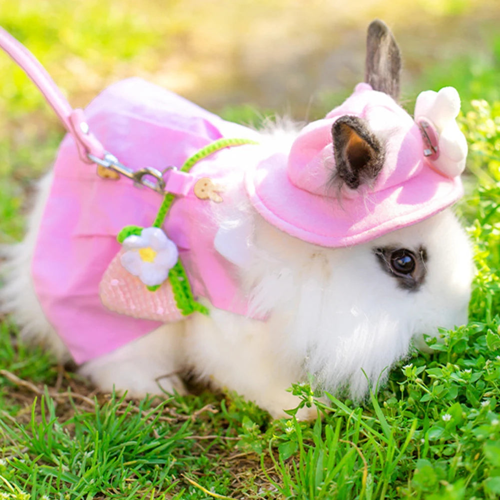 Ce costume complet transforme chaque sortie en moment complice. Le harnais intégré permet de promener votre lapin sans pression sur le cou, tandis que la robe ajustable épouse sa morphologie sans gêner ses mouvements. Le chapeau et le sac ajoutent une touche photogénique irrésistible, parfaite pour les réseaux sociaux ou les événements.