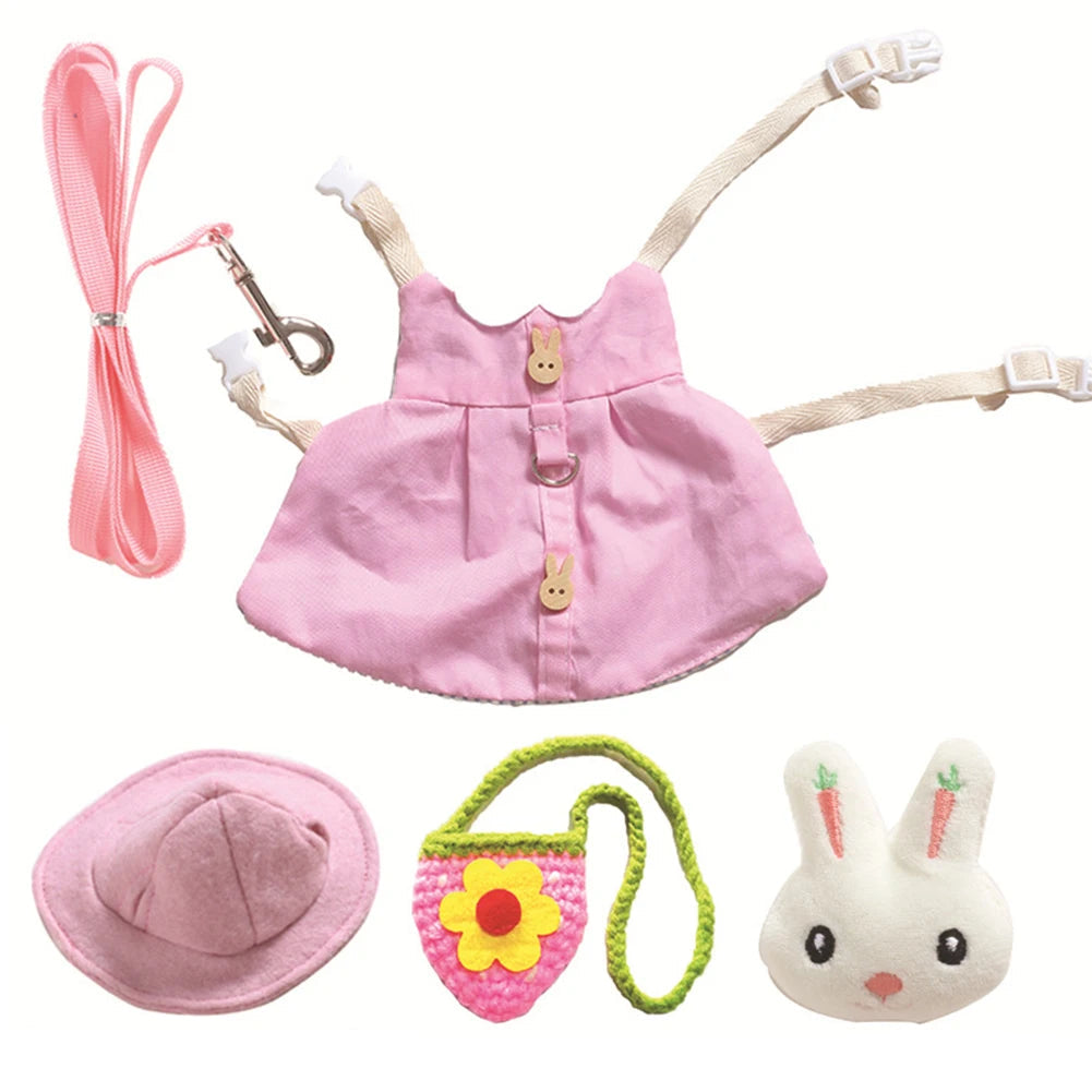 • 🐰 La Combinaison Pour Lapin est un ensemble 5-en-1 conçu pour les balades stylées et sécurisées. Elle comprend une robe harnais réglable, une laisse de 120 cm, un chapeau assorti, un mini sac décoratif et une broche lapin.