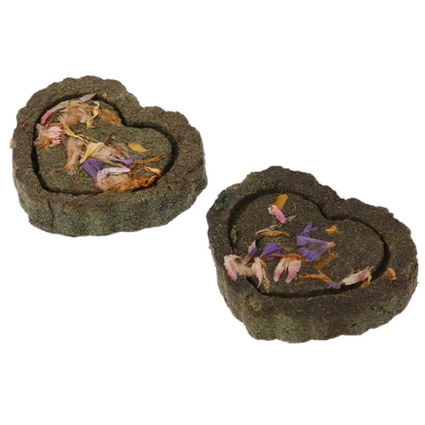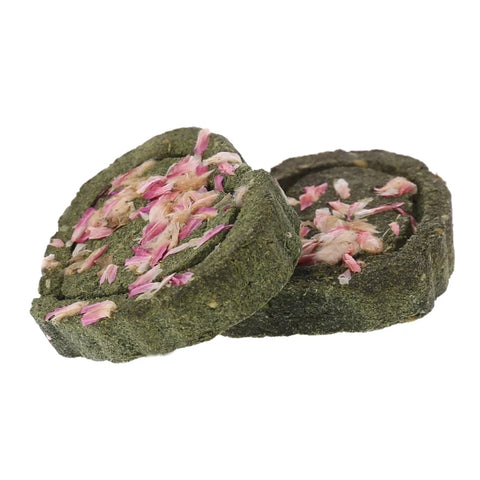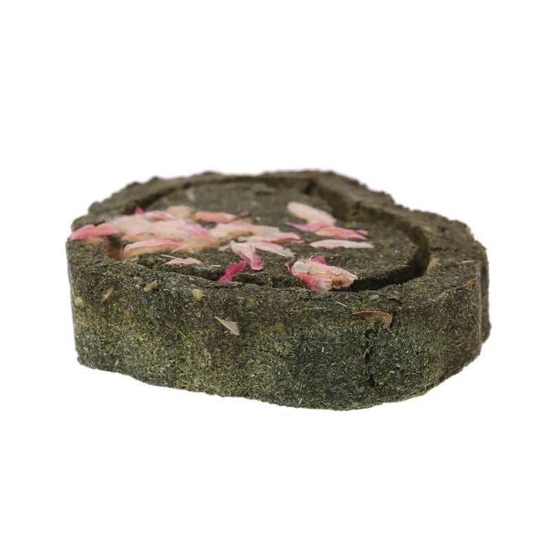 Chaque pièce est fabriquée en herbe compressée. Le matériau est comestible, digestible et riche en fibres, ce qui le rend parfaitement adapté à une consommation partielle. Les fleurs séchées intégrées dans la surface ajoutent une touche sensorielle et visuelle qui stimule l’intérêt du lapin. Ce jouet est aussi un complément à l’enrichissement alimentaire.