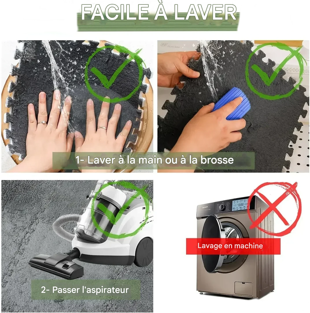 Le tapis peut être lavé à la main, brossé ou aspiré, mais pas en machine. Si une pièce est souillée, il suffit de la retirer et de la nettoyer séparément, sans démonter l’ensemble. Ce système permet un entretien rapide, ciblé et sans contrainte.