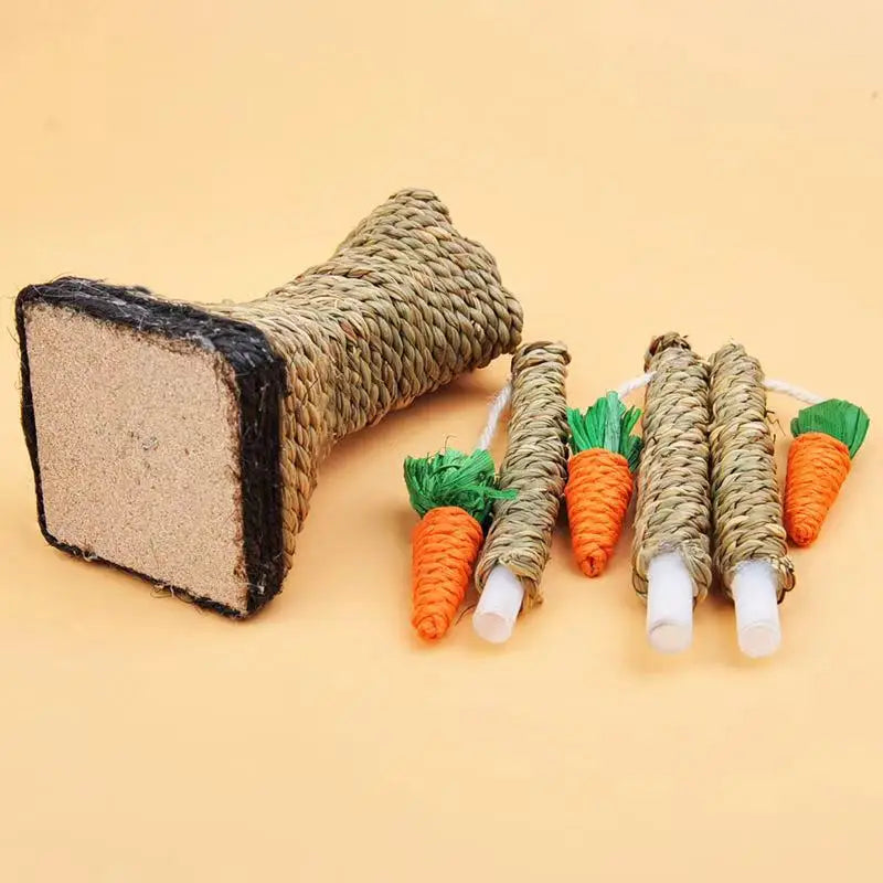 Les lapins ont des dents à croissance continue. Sans objets à ronger, ils peuvent souffrir de douleurs, de malocclusions ou de stress. Ce jouet à mâcher est conçu pour favoriser le meulage naturel des dents, tout en étant entièrement comestible et non toxique. Les matériaux utilisés sont résistants et digestibles, permettant une mastication prolongée. Les carottes suspendues, aux couleurs vives, attirent l’attention et incitent à la mastication, tandis que le tronc en rotin tressé offre une surface idéale pour gratter et grimper.